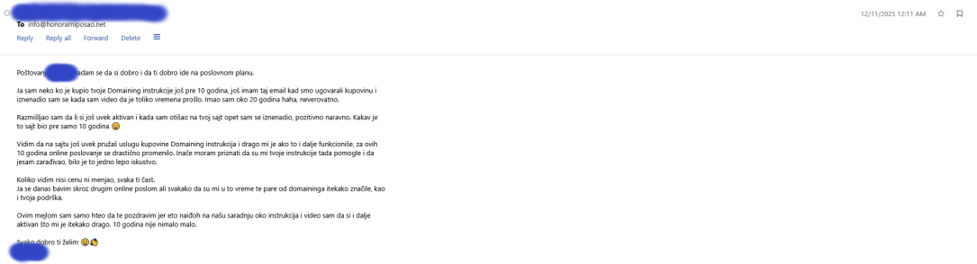 Evo ispod dva screenshota emailova koje sam nedavno primio, a slične redovno dobivam sve ove godine od kad postoji moja web stranica i osobno mi puno znače, iako inače ne objavljujem primljene pohvale ni zahvale jer pod broj 1 poštujem privatnost svakog sa kim imam bilo kakav poslovni odnos (bilo da se radi o kupcu domene, ili o kupcu Domaining instrukcija, ili o investitoru ili bilo kome drugome), a pod broj 2, općenito "testimonialse" ne smatram vjerodostjnima i ne želim ih objavljivati na svojoj web stranici jer svatko može samostalno napisati na svojoj web stranici nešto tipa "U početku sam bio skeptičan, ali onda sam odlučio probati i sada sam oduševljen. Ante iz Splita", kako se obično i piše i što je najčešće samo lažan marketing za naivne. Jer ako nema vjerodostojnih kontakt podataka osobe koja je ostavila testimonial onda on nema značaj (mada i tada može biti neki prijatelj od autora web stranice), a ja naravno ne želim objavljivati ničije kontakte.
